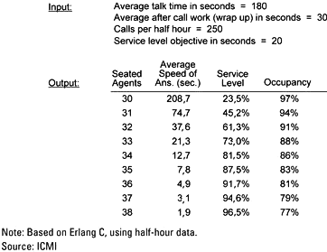 ICMI дает очень наглядный пример взаимосвязи между такими параметрами, как число операторских позиций, средняя скорость ответа, уровень обслуживания и загруженность операторов (рис. 5.3).
