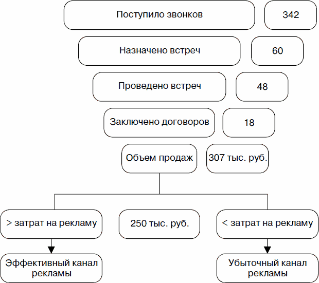 Виртуальные номера очень удобны для ведения замеров эффективности рекламных каналов. Многие клиенты, с которыми я работал, вливали солидные суммы в определенные каналы, не понимая, окупаются ли они. Необходимо организовывать замер эффективности маркетинговых мероприятий. С IP-телефонией это достаточно просто. Предположим, вы участвуете в какой-либо специализированной выставке, смежной с видом деятельности вашей компании. Закрепите за ней определенный номер, который не используется в других рекламных каналах. Укажите его на буклетах, визитках, стенде и т. д. Через месяц, просматривая статистику, собираемую IP-телефонией, проанализируйте итоги участия в выставке. Предположим, с освещаемого на выставке номера вам поступило 342 звонка. Из них было достигнуто договоренностей о встрече 60; 48 встреч состоялось. По их итогам было заключено 18 договоров, из которых на данный момент оплачено 14. На участие в выставке вы бюджетировали 250 тыс. руб. Зная средний чек одного клиента, умножив его на количество завоеванных клиентов, вы поймете, эффективен данный канал рекламы или убыточен. Так необходимо поступать со всеми используемыми вами каналами. Пробуйте разные каналы и иные маркетинговые мероприятия на небольшом бюджете, а затем по итогам замеров масштабируйте эффективные и сокращайте убыточные. Это грамотный подход к финансированию маркетинговых мероприятий (рис. 6.9).