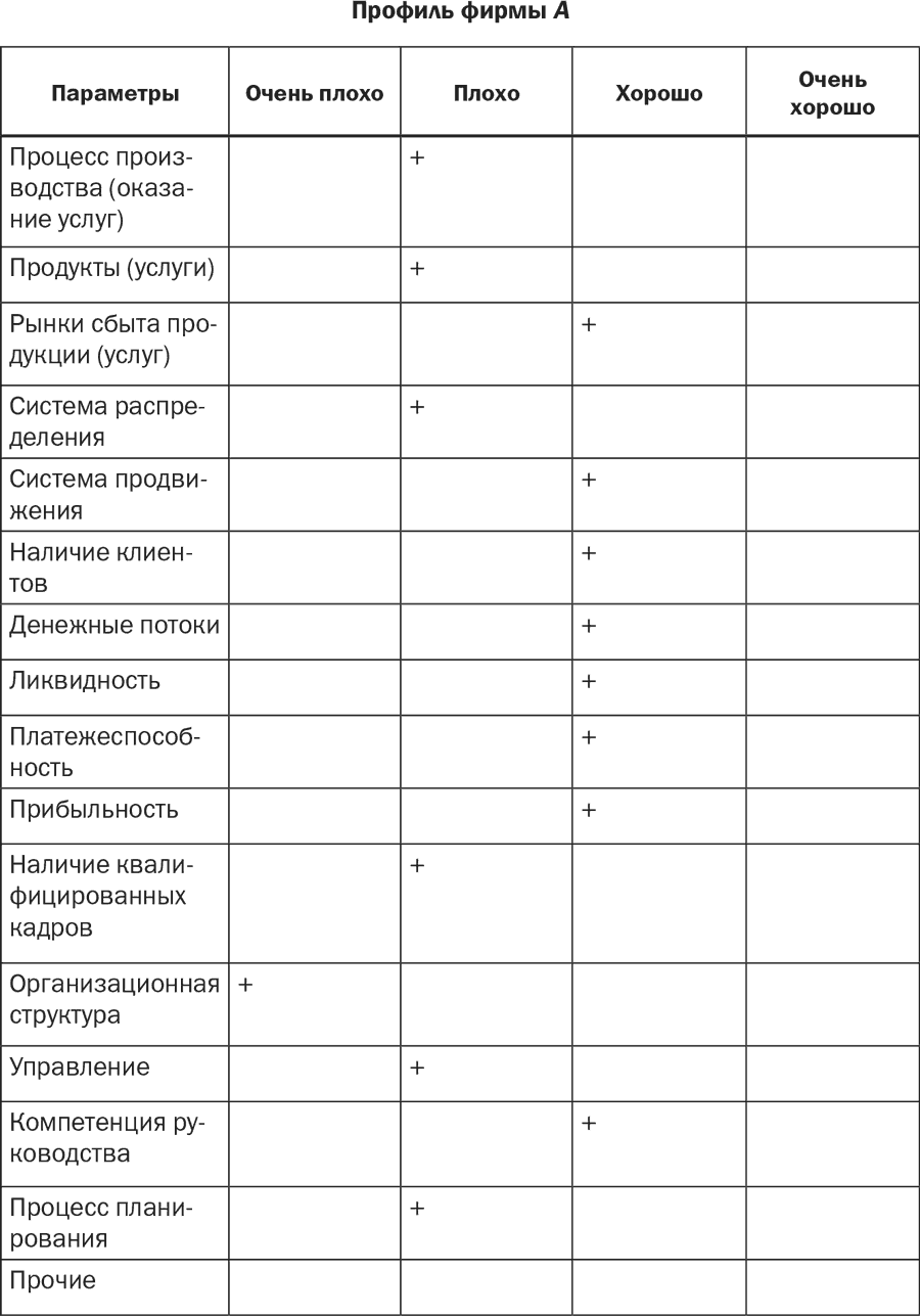 Обратите внимание, что столь любимая многими удовлетворительная оценка, «троечка», в качестве оценки отсутствует, сама форма подталкивает человека к определенности. Он должен подумать и определиться, что считать сильной, а что слабой стороной своей фирмы. Профиль конкретной фирмы А (графическая форма очень наглядна и хорошо запоминается) может выглядеть так, как показано в табл. 2.23.