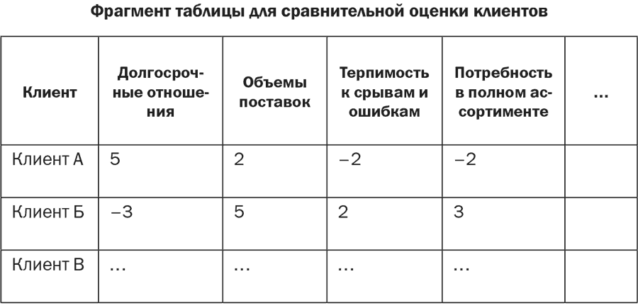 Отсюда видно, что клиент А готов к долгосрочным отношениям, но у него не очень велики объемы поставок, он берет лишь несколько позиций и достаточно нетерпимо относится к нашим задержкам и срывам. Клиент Б, напротив, значительно более терпелив и нуждается примерно в половине нашего ассортимента, он всегда берет по максимуму, но появляется редко, нерегулярно, непредсказуемо. Конечно, простое суммирование баллов мало что дает, но, видимо, следует заняться сбором подробной информации о втором клиенте – нельзя ли перейти с ним к более близким отношениям, для нас он явно предпочтительнее клиента А.