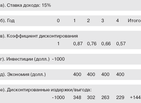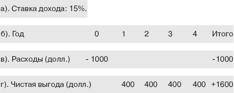 Простая форма ROI ненадежна. Она предполагает, что через четыре года доллар будет стоить столько же, сколько сегодня (в следующем разделе показано, что это неверно). Альтернативная форма ROI допускает, что ценность доллара изменится со временем. Эта форма, называемая IRR (внутренней нормой рентабельности), представляет собой ROI на инвестиции с чистым приведенным доходом (ЧПД), равным нулю. Для этого, прежде всего, надо знать ЧПД. Самое оптимальное решение – поработать с теми правилами, которые использует отдел финансов. Они могут быть ошибочными и ненадежными, но если именно их используют, принимая решения, то имеет смысл придерживаться этих правил.