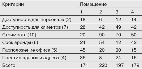 Итак, на первый взгляд, помещение № 1 лидирует с большим отрывом. Но генеральный директор отмечает, что критерии оценки, как и все управленцы, неравнозначны. Генеральный директор устанавливает значимость каждого критерия, и получаются следующие результаты (невзвешенная оценка умножается на значимость критериев):