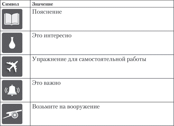 На страницах книги вы увидите символы. Это условные обозначения в виде пиктограмм, которые помогут расставить акценты и лучше запомнить важное. Ниже приведены знаки, встречающиеся в тексте, и даны их значения.