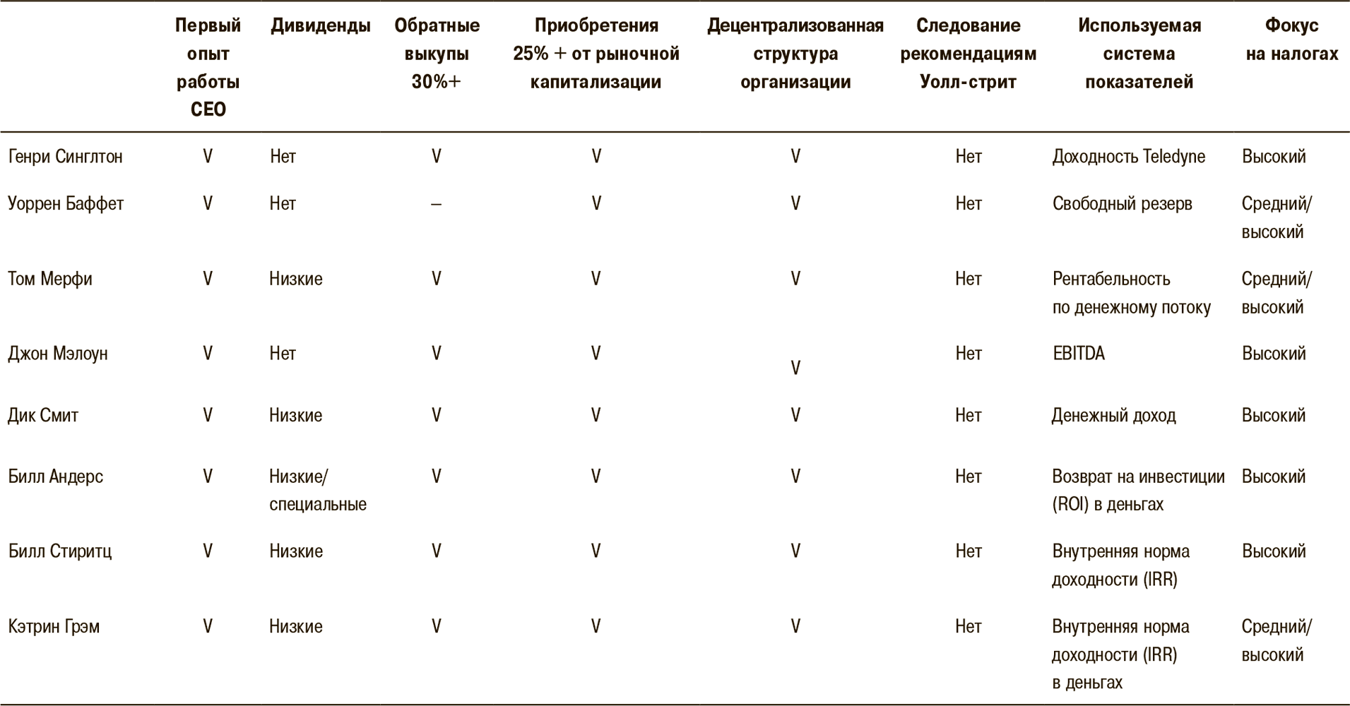 Оказавшись в разных сферах бизнеса и рыночных условиях, СЕО-аутсайдеры придерживалась схожего набора основных принципов, предпринимали действия, отличные от конкурентов, и достигли невероятных результатов. Как показывает табл. 9.1, они следовали почти одному и тому же сценарию: отказывались от выплаты дивидендов, делали рациональные (по возможности крупные) приобретения, выборочно пользовались заемными средствами, проводили значительные обратные выкупы акций, минимизировали налоги, управляли децентрализованными организациями и фокусировались на денежном потоке, а не на объявленной чистой прибыли.