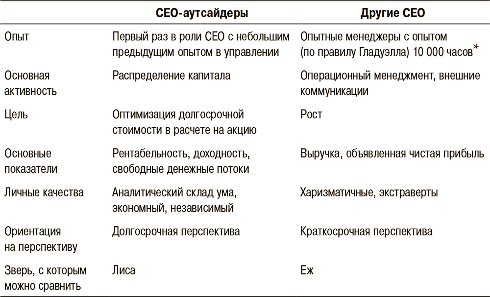 Итак, вернемся к вопросу: для кого актуальны опыт и уроки СЕО-аутсайдеров? Коротко говоря, практически для каждого менеджера или владельца бизнеса. Хорошая новость: вам не нужно быть маркетинговым гуру, техническим гением или харизматичной личностью, чтобы стать крайне эффективным СЕО. Однако вам просто необходимо уметь распределять капитал и тщательно продумывать, как наилучшим образом разместить ресурсы компании, чтобы создать стоимость для акционеров. Вы всегда должны задаваться вопросом о том, какова будет доходность ваших вложений, и продолжать реализовывать только перспективные проекты. А еще вам понадобится уверенность в том, что при необходимости вы сможете действовать самостоятельно, без оглядки на коллег. Менеджеры и предприниматели, которые следуют этим принципам, рациональны, независимы и способны разыграть полученные карты с наибольшей выгодой – на пользу и радость своим акционерам.