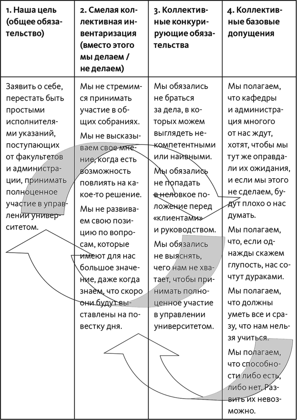 Как и в случае преодоления личного иммунитета, вам нужно найти выход из системы, а не попасть в нее с другого входа. Один из сотрудников компании профессиональных услуг сказал, что вздохнул с облегчением, когда не пришлось в очередной раз торжественно поднимать бокал за успешное развитие команды. Он имел в виду годы, когда его коллектив пытался решить адаптивные проблемы (наладить сотрудничество в группе) техническими средствами. Вашего искреннего намерения и срочности вопроса недостаточно. Нужно менять коллективный образ мышления, «защищающий» всю группу от достижения желаемой цели. Когда вы начнете работать над преодолением иммунитета, вам откроется целый водоворот незамеченных поступков, которые сводят на нет стремление к цели. (Вспомните случаи, описанные в части II.)