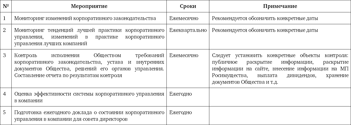 Состав задач, которые решаются в названной области корпоративным секретарем, вполне поддается планированию. При этом часть работ будет носить регулярный характер. Остальные будут определяться содержанием решений совета директоров.