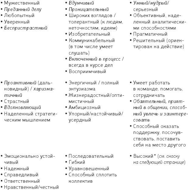 Недостаток подобных списков – в их неполноте. К примеру, почему в приведенном выше не упомянуты ни ум, ни умение слушать? Разумеется, эти качества есть в других списках. А потому я составил подробный список на основе всех списков, которые сумел найти, плюс добавил в него несколько собственных любимых пунктов. В конце раздела вы найдете таблицу, в которой 52 качества. Если насчитаете у себя все 52 – значит, вы просто обязаны быть чертовски эффективным менеджером (правда, возникает вопрос, человек ли вы вообще).