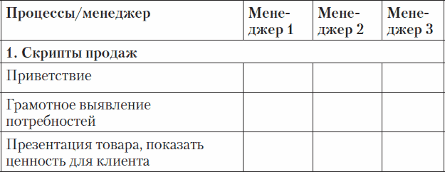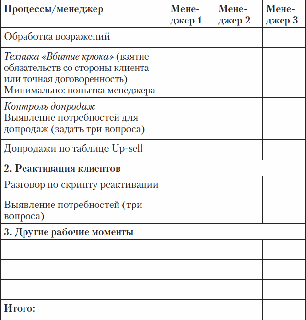 Прослушивание записей телефонных разговоров – это выборочный контроль. Но проводиться он должен регулярно и касаться каждого менеджера. Как правило, данная функция возлагается на руководителя отдела продаж. Он, зная этапы продаж, содержание скриптов, продающие фишки, способен оценить качество работы менеджеров. По итогам прослушивания руководитель составляет отчет. В первую очередь проверяется следование скриптам, соблюдение корпоративных норм и вежливость с клиентом (табл. 6.4).