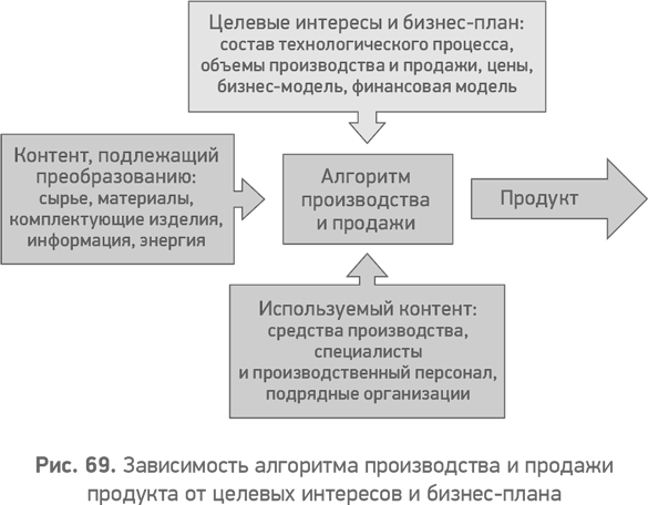 От чего зависит алгоритм производства и продажи продуктов? Конечно, от первых двух компонентов: целевых интересов и бизнес-плана (рис. 69).