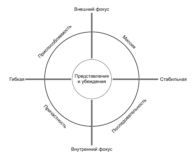Организация с внешним фокусом и акцентом на гибкость, или перемены, должна обладать культурой адаптивности (способностью приспосабливаться). Организация с внутренним фокусом и гибкостью будет иметь культуру, способствующую делегированию полномочий сотрудникам и ориентированную на командную работу
