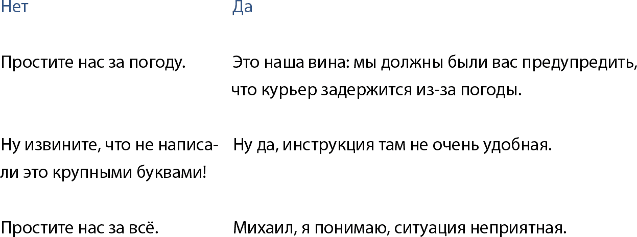 Признать вину в том, в чем вы накосячили, если вы действительно сделали что-то, что расходится с ожиданиями клиента. Но тут важно не быть бакланом и не извиняться за то, чего вы не делали, или за то, в чем вы не виноваты.