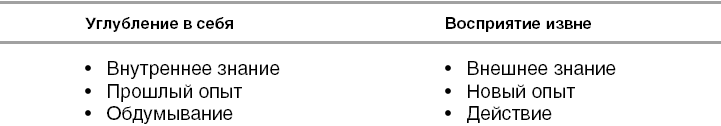 Если использовать обратный подход к изменениям, то есть «изнутри наружу», вы ничего не добьетесь. Вопреки распространенному мнению излишний самоанализ удерживает нас в прошлом, ослабляет восприимчивость, не позволяет нам раскрыть свой лидерский потенциал и подготовиться к фундаментальным переменам в окружающей обстановке (таблица 1–1). Это чем-то напоминает поиск потерянных часов под уличным фонарем, в то время как для решения новых задач требуется более широкий обзор: свежие, внешние точки зрения, с которыми мы знакомимся при выполнении различных действий. Карл Вейк, великий социальный психолог, выразился очень лаконично: «Как я могу узнать, кто я, пока не увижу, что я делаю».