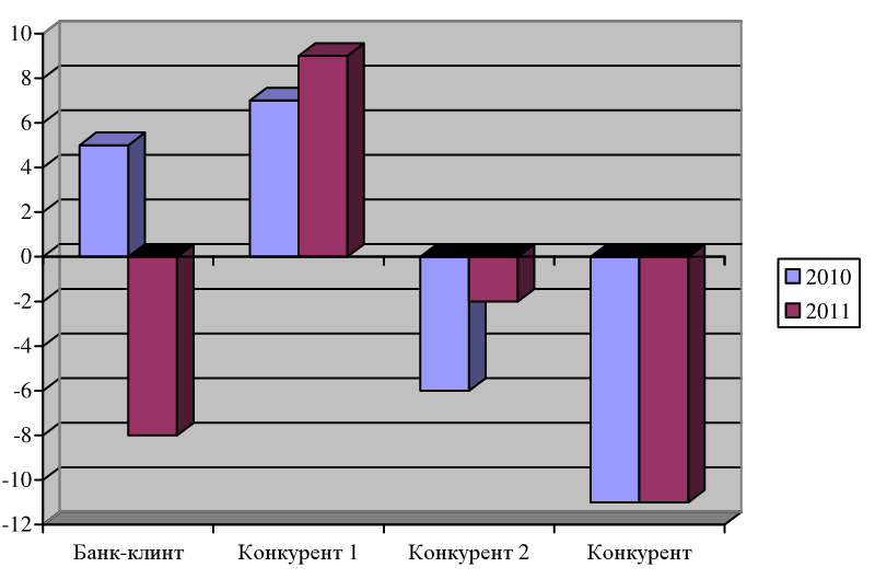 Внутренние изменения в компании влияют на репутационный индекс. На рисунке 33 видно, что с 2008-го по 2011 год банк развивался, соответственно, повышался его рейтинг. Затем развитие несколько затормозилось, а теперь и вовсе остановилось. Было выяснено, что наибольшие потери принес уход ряда корпоративных клиентов – компаний малого и среднего бизнеса. Сравнение банка с основными конкурентами рынка (рисунок 34) показывает, что его показатели значительно упали.