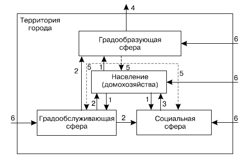 1 – трудовые ресурсы; 2 – продукция и услуги городского хозяйства; 3 – услуги социальной сферы; 4 – продукция и услуги градообразующих предприятий; 5 – часть продукции и услуг градообразующих предприятий, реализуемая внутри города; 6 – продукция и услуги со стороны