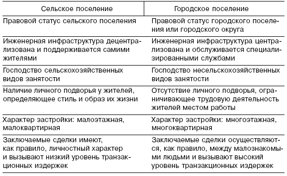 Наиболее существенным является различие между городскими и сельскими муниципальными образованиями, которое вытекает из различия видов хозяйственной деятельности, формы расселения и уклада жизни в городской и в сельской местности. Для сельских поселений в большей мере характерна адаптация к природной среде, тогда как для городов преобладающую роль играет их целевая функция. Основные различия между городскими и сельскими поселениями представлены в табл. 1.1.