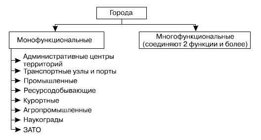 В России по функциональному признаку можно выделить административные центры территорий, промышленные, ресурсодобывающие, агропромышленные города, транспортные узлы и порты. Так, из числа малых и средних городов России 58 % выполняют агропромышленную функцию, 75 % – промышленную, 70 % – транспортную, 32 % – рекреационную, 21 % являются городами-спутниками и специализируются на обслуживании крупных городов. Свои особенности имеют курортные города, наукограды, закрытые административно-территориальные образования (ЗАТО). Однако большинство городов, в том числе все крупные и крупнейшие города, имеет многофункциональное назначение (рис. 1.2).