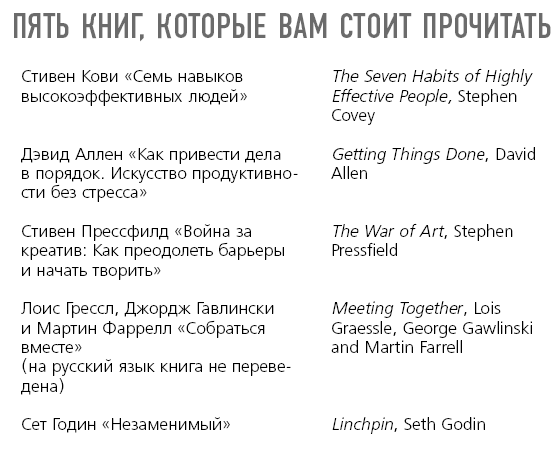 Хотя я считаю книгу одним из самых полезных средств развития, в работе над любым руководством, где даются практические советы о приемах и стратегиях работы, есть серьезный подвох. Она нередко устаревает еще до выхода, поскольку программное обеспечение в области повышения продуктивности развивается стремительно. Еще один подвох: в мире существует огромное множество полезных программ, а в своей работе я обычно использую только одну, хотя и другие программы не хуже. В блоге нашей компании Think Productive мы периодически печатаем статьи об интересных новых программных продуктах, появляющихся на рынке. Если вы подпишетесь на нашу рассылку, то всегда будете в курсе новинок! Хочу еще раз напомнить, что мой выбор всегда основывается только на личном опыте. Я совершенно объективен. От компаний, продукты которых я рекомендовал в этой книге, я не получил ни цента за рекламу.