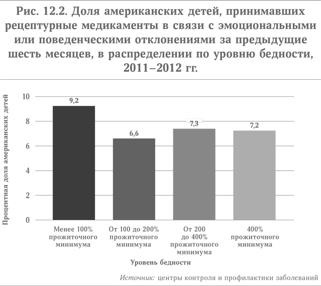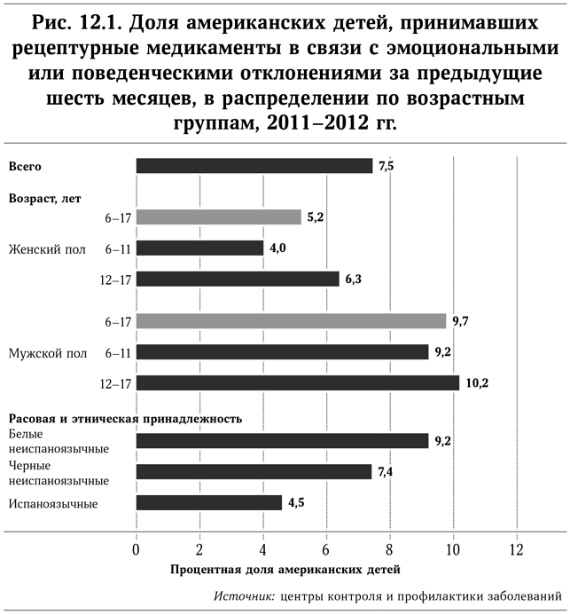 Рост распространенности медикаментозного лечения затрагивает все возрастные группы. Рецептурные лекарства в связи с эмоциональными или поведенческими нарушениями прописывают более чем 9 % юных американцев в возрасте от 6 до 17 лет. Такие же лекарственные средства прописывают более чем 7 % черных американских детишек и 4,5 % испаноязычных. Это очень высокие показатели – почти каждый десятый белый американский ребенок принимает рецептурные лекарства.