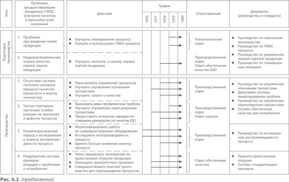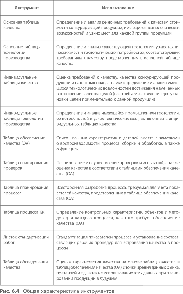 Поскольку одной из основных задач руководства было создание системы обеспечения качества (QA), Kayaba разработала ряд инструментов для обеспечения соответствия технологии и качества на каждом этапе, начиная с разработки продукта и далее в ходе производства, продаж и обслуживания потребителей. На рис. 6.4 и 6.5 представлены некоторые из этих инструментов и показано, как они используются в компании.
