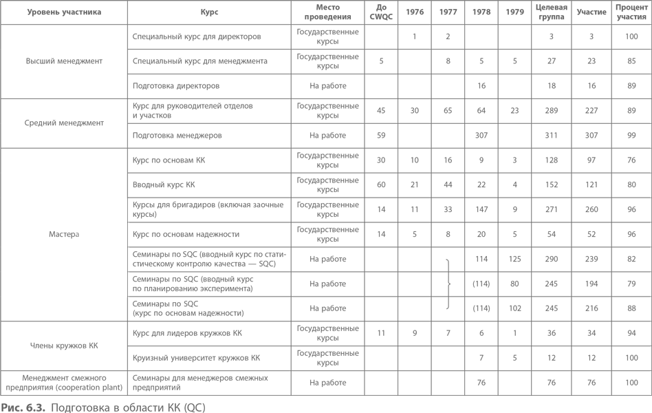 Кроме того, в 1976 г. Kayaba развернула широкую работу по пропаганде концепции TQC. Асано говорит, что абсолютно необходимо, чтобы президент или второе лицо в компании были преисполнены решимости внедрить TQC. Поскольку главы подразделений и директора заводов тоже должны стать убежденными сторонниками TQC, их посылают на семинары по всеобщему контролю качества для высшего менеджмента, а кроме того, оказывают содействие в посещении других компаний, которые уже применяют данную стратегию. Помимо этого ведется работа по активизации массового участия в TQC рабочих, включая предложения от кружков КК. На рис. 6.3 представлена программа Kayaba по подготовке в области контроля качества.