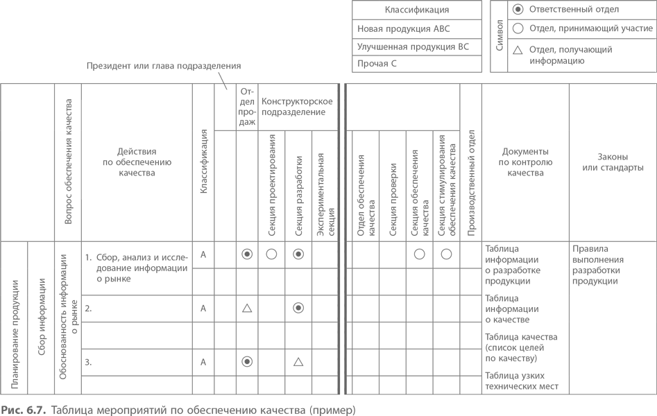 Рис. 6.6 показывает структурную схему обеспечения качества на Kayaba. Разрабатывая эту диаграмму, на предприятии сначала пытались взять за основу схемы других компаний, но вскоре обнаружили, что модели бизнеса и процедуры отчетности в разных организациях так сильно отличаются, что трудно говорить о преимуществах той или иной системы. Эта схема показывает, какое участие принимает каждое подразделение на той или иной стадии, начиная с планирования продукции и до продаж, обслуживания и мониторинга.