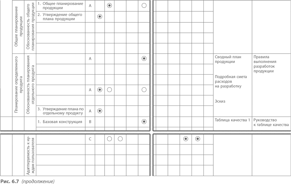 Рассматривая существующие практики как подготовительные для разработки этой структурной схемы, Kayaba обнаружила, что разные подразделения не согласуют свои действия друг с другом и четко определенная процедура отчетности, соответствующая распределению ответственности при переходе от одного этапа к другому, отсутствует. После составления этой схемы потребовалась таблица обеспечения качества. Она показана на рис. 6.7. Эта QA-таблица помогает каждому сотруднику понять, что ему следует делать для обеспечения качества. Кроме того, в ней представлены документация и отчеты, нужные для поддержки таких мероприятий, а также правила и стандарты, которым надлежит следовать.
