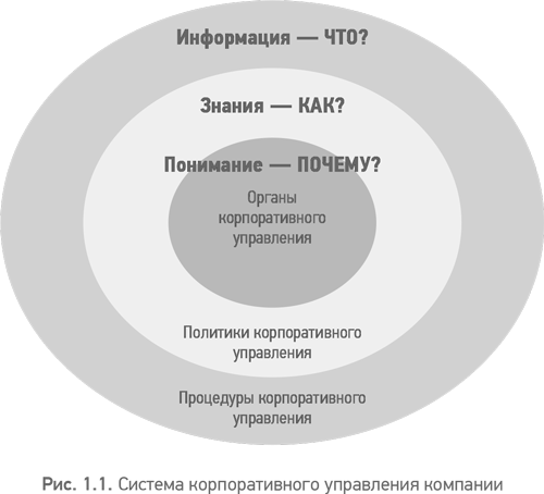 В этом контексте хочется отметить, что известный специалист в области системного анализа Д. Гараедаги в книге «Системное мышление»{5} выделяет три уровня влияния системных принципов на среду – понимание (отвечает на вопрос «почему?»), знания (отвечает на вопрос «как?») и информацию (отвечает вопрос «что?»). На мой взгляд, такая декомпозиция практически идентична вышеприведенной декомпозиции системы корпоративного управления компании. Органы корпоративного управления обеспечивают понимание сущности корпоративного управления в компании и отвечают на вопрос, «почему» («зачем») оно нужно компании. Политики корпоративного управления представляют собой знания о предмете корпоративного управления и отвечают на вопрос, «как» оно, собственно, будет осуществляться в компании. Процедуры корпоративного управления являются информацией (содержанием) о корпоративном управлении и отвечают на вопрос, «что» будет в реальности происходить в компании.