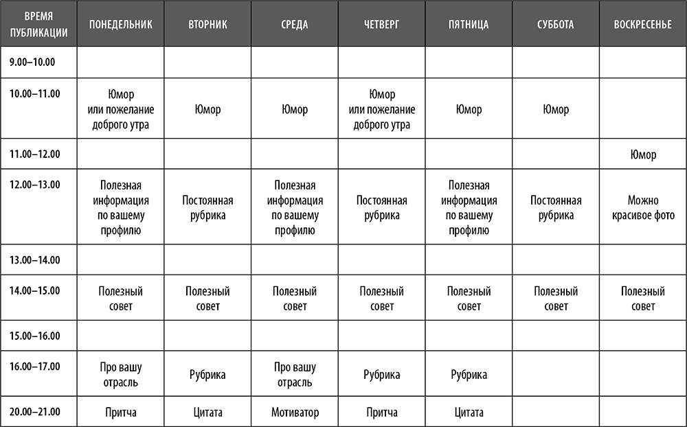 ? Полную версию таблички со всеми временными промежутками и рекомендациями по общетематическому контенту скачайте на сайте книги www.fbprosto.com