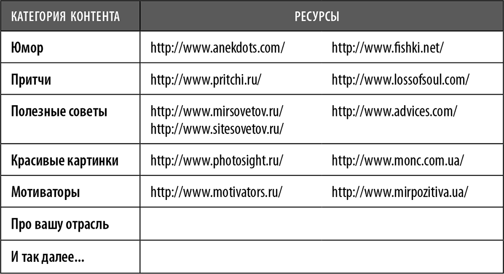 Для подбора общего контента составьте список сайтов с анекдотами, цитатами, притчами и т. п. Подписывайтесь на всевозможные бизнес-цитатники, ресурсы с красивыми фотографиями.