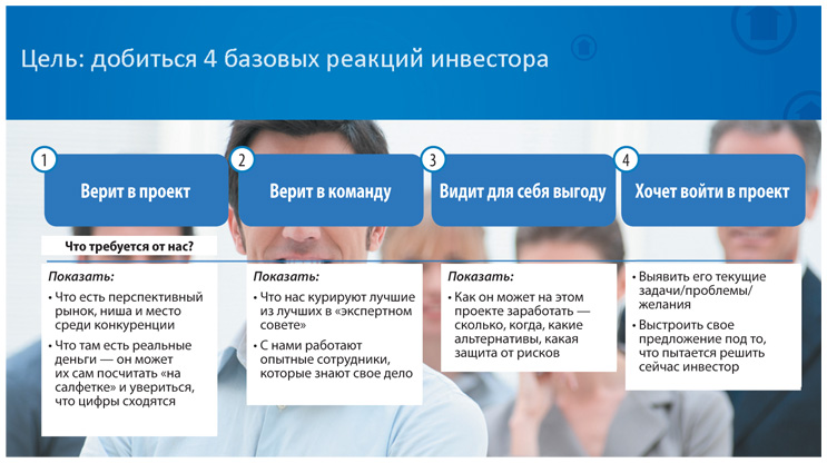 Когда мы работаем над задачей привлечь инвестиции, презентуя наш проект, мы должны вызвать четыре реакции инвестора. Если мы как предприниматели не добились хотя бы одной из них, сделка не состоится.