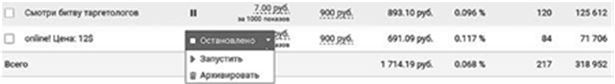 • отправить рекламу на модерацию (кликните на значке в строке с названием кампании и выберите «Запустить»); после успешного прохождения модерации реклама сразу же отправится в ротацию; если вы этого не хотите — нажмите «Запустить» и сразу же «Остановлено» (рис. 2.23);