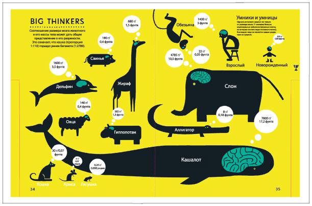В контексте управления на основе данных я не большой поклонник инфографики: сегодня инфографика превратилась в «веселые картинки», приправленные парой фактов, которые обычно создают дизайнеры, а не аналитики. По моему мнению, у подобной инфографики слишком низкое соотношение данных и чернил (data-to-ink ratio), как его определил Эдвард Тафти. Фактически в большинстве случаев инфографика страдает от «графического мусора» и от недостатка данных. Например, на рис. 7.11 в забавной и визуально привлекательной форме представлен размер мозга у животных с разной массой тела.