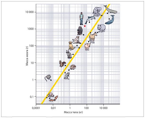 Рис. 7.12. Соотношение массы мозга и общей массы тела. (Обратите внимание: обе оси логарифмические, но интервал по оси х составляет 100х, а интервал по оси y — только 10х).