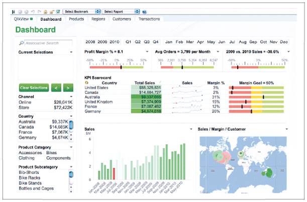 Рис. 7.13. Дашборд для топ-менеджмента компании на платформе QlikView (http://www.qlik.com/us/) показывает KPI по продажам в региональном разрезе