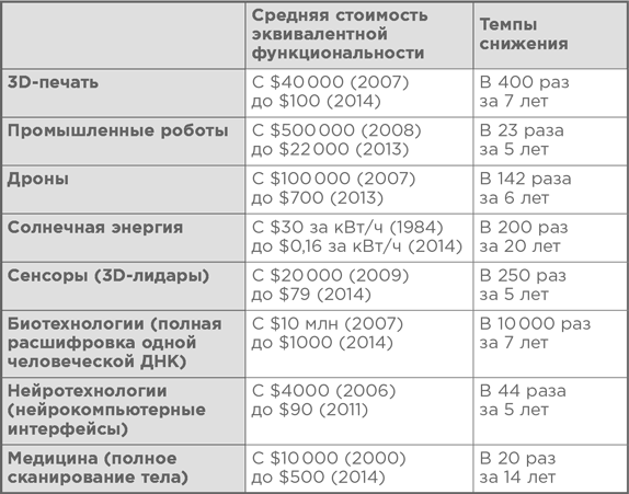 И это происходит не только в биотехнологиях и робототехнике. Такое резкое падение стоимости можно увидеть в широком спектре других областей, а именно: