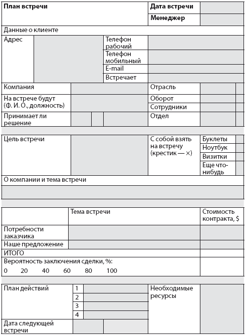 После того как договорились о встрече, рекомендую составить план встречи. Понимаю, что многие из вас просто записывают адрес клиента где попало: на бумаге, в ежедневнике или в телефоне. Если хотите серьезно подготовиться к встрече с потенциальным клиентом, лучше составьте план. Он необходим особенно в тех случаях, когда на деловую встречу вы планируете идти с коллегами или с руководителем. Показал план встречи – все становится понятно, куда едем и что будет обсуждать!
