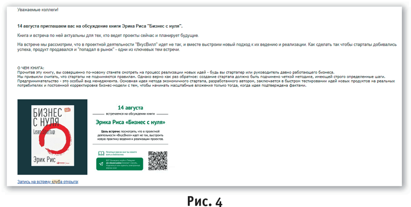 Мы покупаем эту книгу в офис в нужном количестве, как правило 50–70 экземпляров. Далее рассылается письмо по всем сотрудникам (в офис и магазины). В нем содержится короткая рецензия, объявляются дата и место встречи (рис. 4). Участие в книжном клубе добровольное. В этом вопросе насильно мил уж точно не будешь.