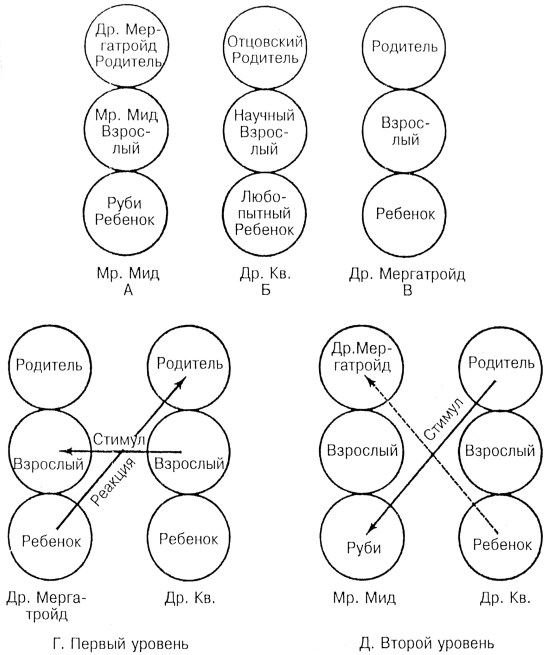 Обмен репликами между доктором Кв. и доктором Мергатройдом во втором эксперименте доктора Кв. проанализирован в трансакционной диаграмме на рисунке 20Г. Первый шаг в составлении такой диаграммы – подготовка структурной или персональной диаграммы для каждого участника. Рисунок 20А показывает личность мистера Мида. Поскольку структура личности сложна, нужно внимательно вдуматься в нижеследующее объяснение.