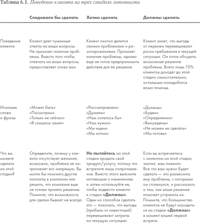 Просто вслушиваясь в слова вице-президента, Кэтрин может определить уровень готовности руководства магазина и использовать полученные знания для того, чтобы подвести его к стадии «Должны». В таблице 6.1 приведены примеры высказываний и поведения клиентов и соответствующие им стадии готовности.