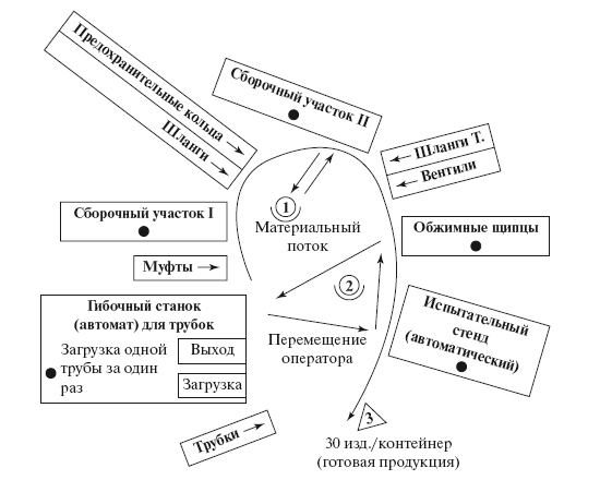 Обычная конфигурация ячейки – в виде буквы U, поскольку именно такая конфигурация позволяет до минимума сократить переход операторов от одной операции к другой и обеспечивает возможность различной последовательности выполнения задач. Данный фактор имеет большое значение при организации бережливого производства, поскольку число операторов в одной ячейке может меняться в зависимости от изменения спроса. Кроме того, U-образная конфигурация позволяет одному и тому же оператору выполнять первую и последнюю операции процесса (или весь процесс целиком), что способствует поддержанию темпа работы и сохранению ровного движения потока. Кроме того, это позволяет возложить на оператора полную ответственность за качество продукта на выходе ячейки.