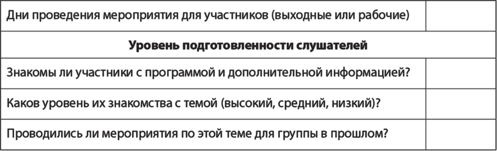 Когда начинаешь изучать своих будущих слушателей заранее, тем самым проявляешь к ним уважение, а уважение, в свою очередь, становится основой для нормальных, а не пугливо-агрессивных взаимоотношений. Помешать этой работе может только привычка откладывать все на потом или недостаток времени.