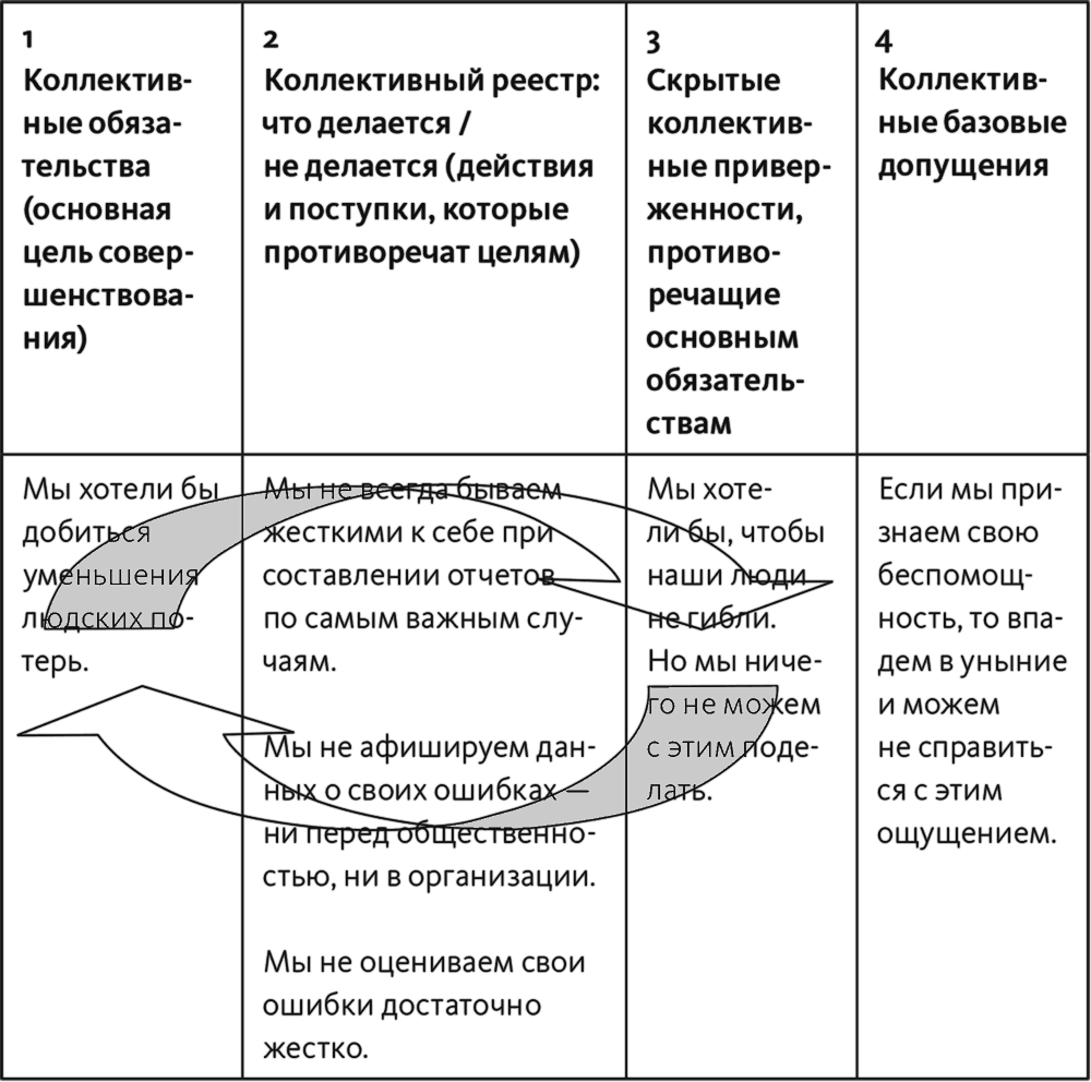 Мы не видели более шокирующей первой колонки с коллективными целями за многие годы работы: «Наша общая цель в том, чтобы снизить людские потери». Но с самого начала нас предупреждали: шансы на то, что эти люди займутся самодиагностикой, призрачны. (Мы слышали это много раз, когда работали с группами людей, обычно считающихся жесткими и недоступными: профессиональными судьями, генеральными директорами, сотрудниками ЦРУ, хирургами, директорами школ, лидерами Израиля. Но мы никогда не встречали группу, которая бы в итоге отказалась участвовать в этой работе.)