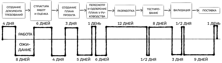 Рис. 8.2. Эта карта потока ценности показывает, как объект в проекте разработки программы проходит через традиционный цикл управления проектами. Команда может его использовать, чтобы отчетливее видеть, где время тратится впустую