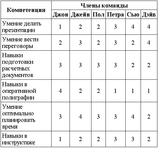 Есть продолжение данной модели (на него я также буду регулярно ссылаться в этой книге) – матрица компетенции, – которая поможет вам рассмотреть нужды вашей команды в целом, а не по отдельности, как нужды штатных сотрудников. Эта матрица показана в следующей таблице.