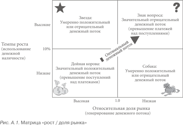 Эти исходные условия позволяют составить портфель, изображенный на схеме (рис. А.1), в которую могут быть внесены все подразделения фирмы. Хотя шкалы показателей роста и относительной доли рынка выбираются произвольно, такая схема обычно разделена на четыре сектора. Основная идея состоит в том, что подразделения бизнеса, расположенные в каждом секторе, характеризуются существенными различиями в денежных потоках и должны управляться по-разному. Отсюда следуют выводы относительно того, как фирма должна строить свой совокупный портфель.