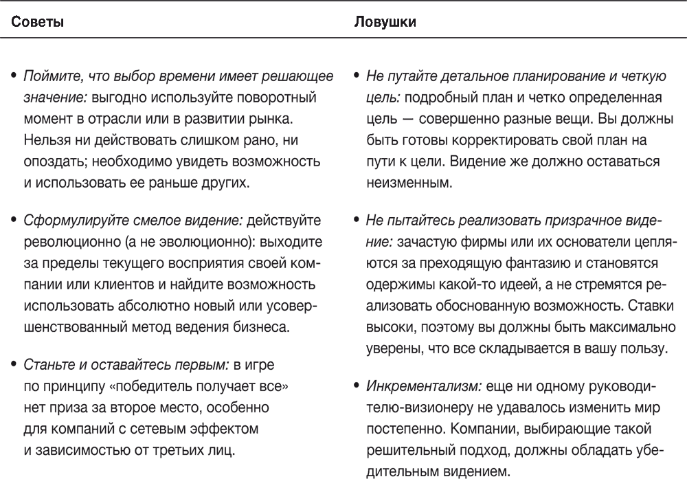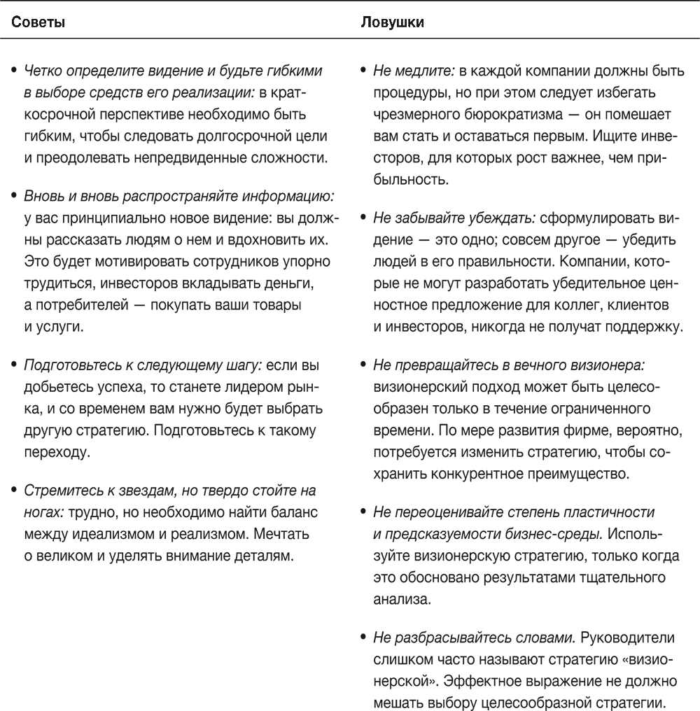 В таблице 4–1 приводятся некоторые советы и описание возможных ловушек при выборе и реализации визионерской стратегии.
