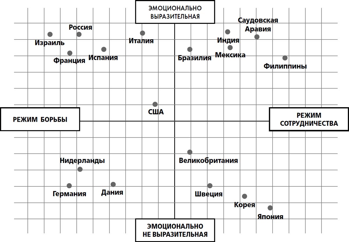 Почему же так происходит? Дело в том, что у русского человека очень сильно активирован режим безопасности. Ранее я уже описывал в своих книгах методику, которую изложил С. И. Харитонов, – это методика построения систем безопасности с целью партнерства. Безопасность – режим недоверия друг другу, поэтому, как только мы входим в переговоры, у нас активируется режим безопасности, порождающий впоследствии борьбу, в связи с чем у нас развивается большое недоверие друг к другу. Именно поэтому надо учитывать данную особенность российского менталитета, а также особенность западных партнеров (Европы, Америки и некоторых других стран), которые заходят в переговорный процесс чаще с режимом партнерства и сотрудничества, нежели с режимом борьбы. На схеме можно увидеть, какой режим используют разные страны, расположенные на данной оси.