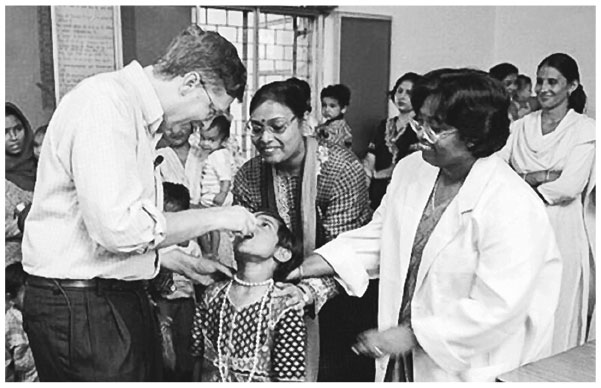Билл Гейтс дает пероральную полиомиелитную вакцину ребенку в Мумбаи, Индия (2000)