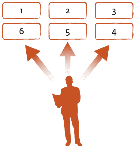 …и снова возвращаться к первому сектору. Для того чтобы охватить зал, который рассажен более широко, необходимо разделить его пополам по горизонтали и каждую половину – еще на три сектора.